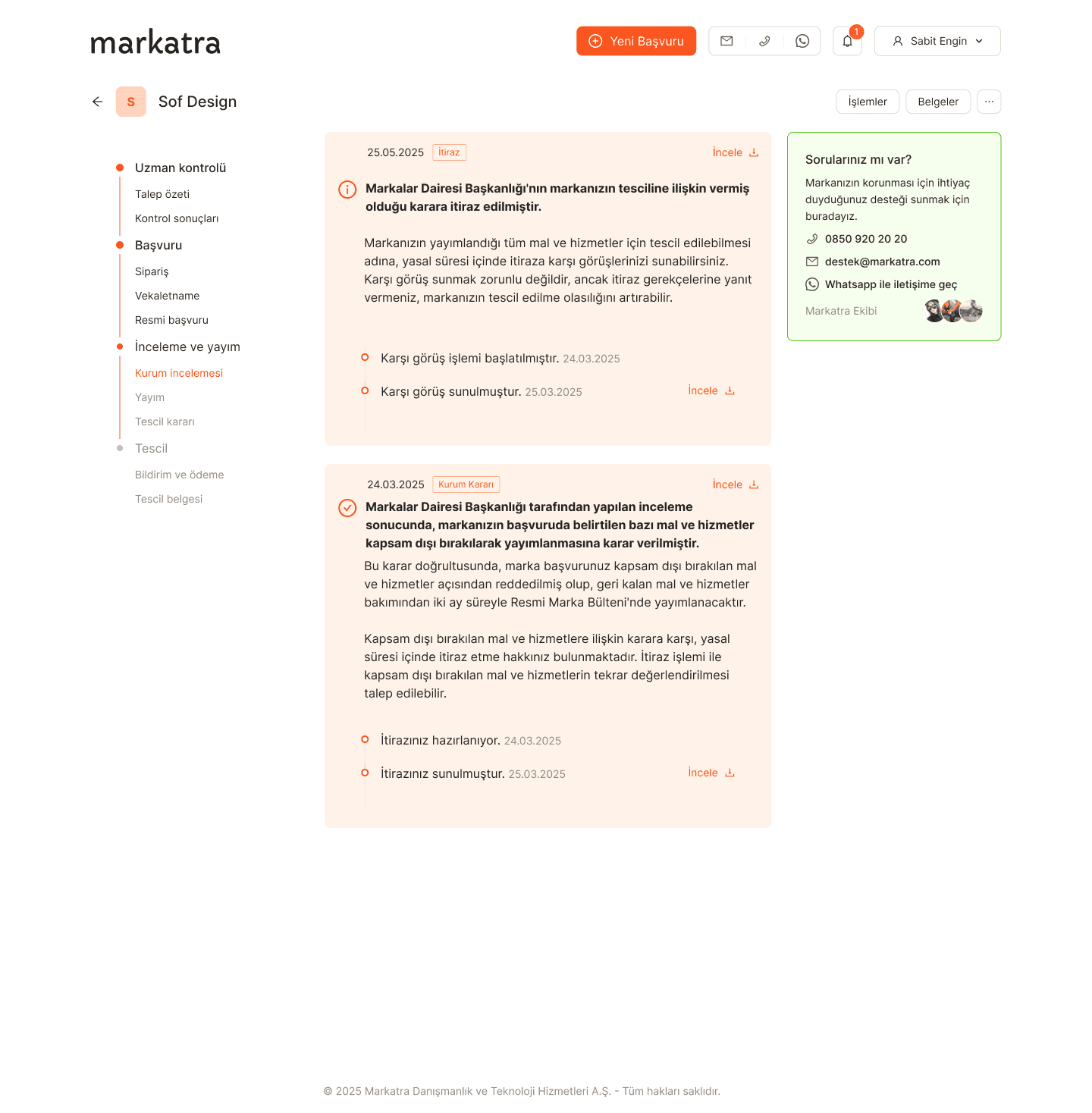 Başvurunuz, Kurum tarafından şekilsel olarak incelenir ve markanızın diğer markalarla olan benzerliği araştırılır. İnceleme sonucunda, başvurunun şeklen bir eksiklik taşımadığı ve ayırt edici olduğu belirlenirse, başvurunuzun Resmi Marka Bülteni'nde 2 ay süre ile yayımlanmasına karar verilir. Yayım süresi boyunca diğer marka sahipleri başvurunuzu inceleyerek itirazda bulunabilirler. Tüm süreçlerin tamamlanması, 3 ay ile 12 ay arasında bir süre alabilir. Başvurunuz hakkında verilen kararlara ve başvurunuza yapılan itirazlara üye paneliniz üzerinden erişebilirsiniz. Ayrıca, üye paneliniz üzerinden bu karar ve itirazlara karşı eylemde bulunmanız mümkündür. Daha fazla hukuki bilgiye ihtiyaç mı duyuyorsunuz? Herhangi bir işlem yapmadan önce uzmanlarımızla ücretsiz olarak görüşebilirsiniz.